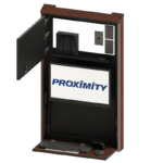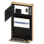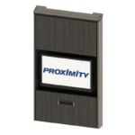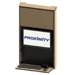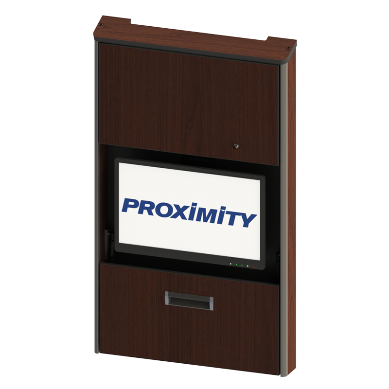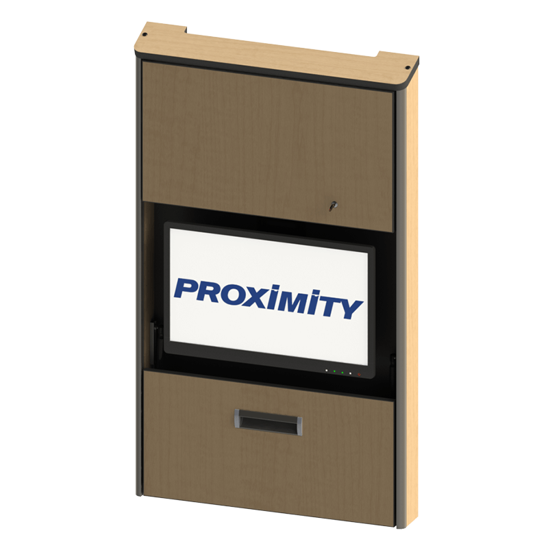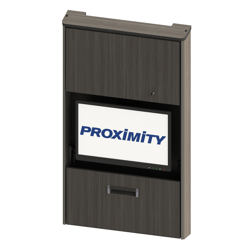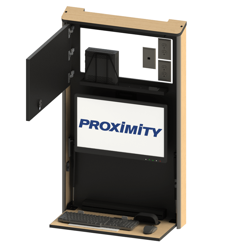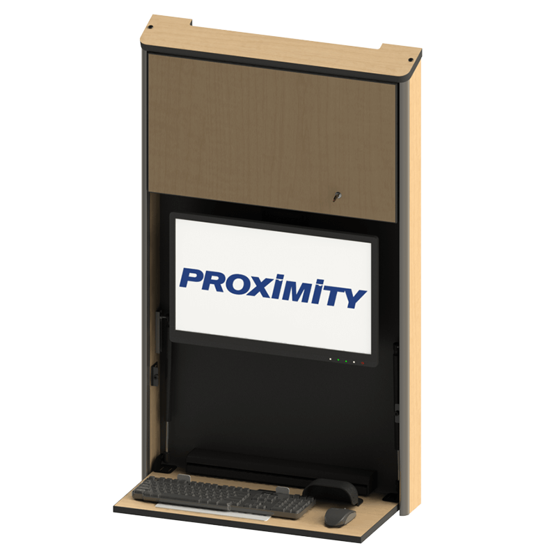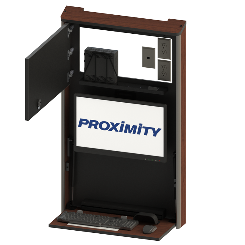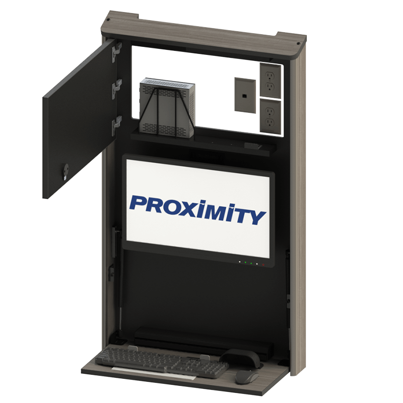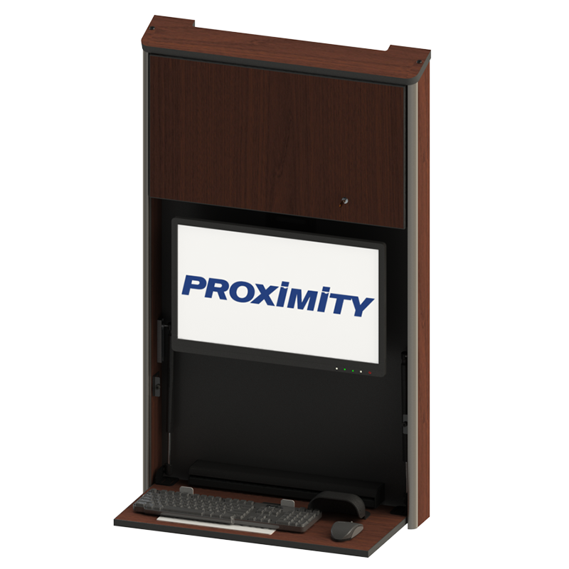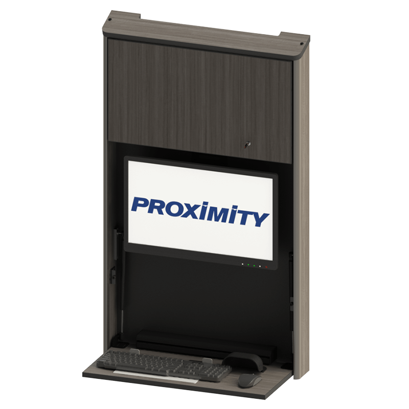 The Embrace™ Open Face Slim wall mounted computer workstation for egress areas and an open face monitor. Unit is 4in (10cm) thin, with secure CPU storage, cable management, KB and Mouse storage.