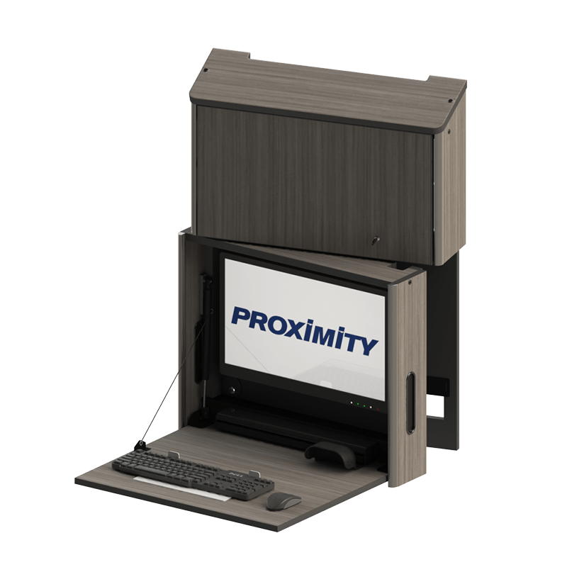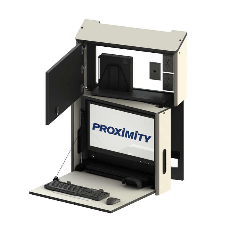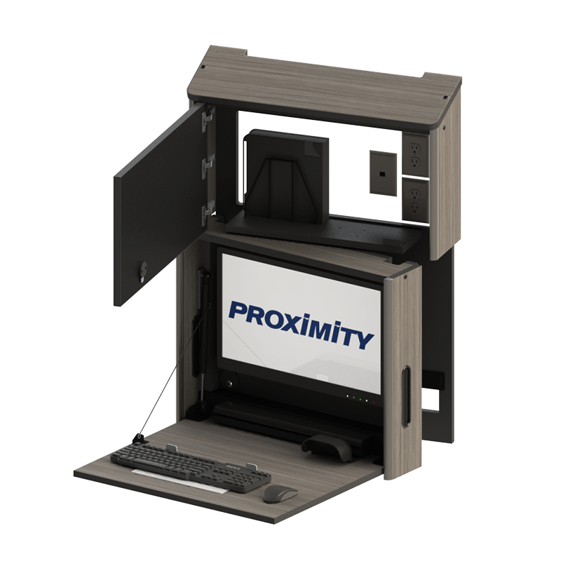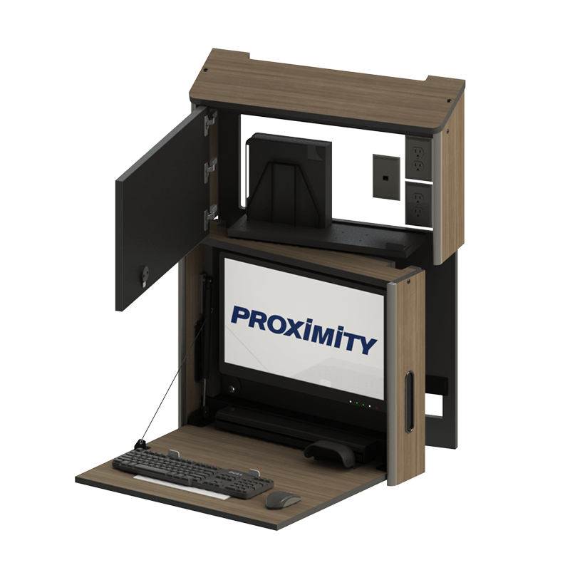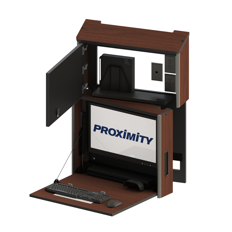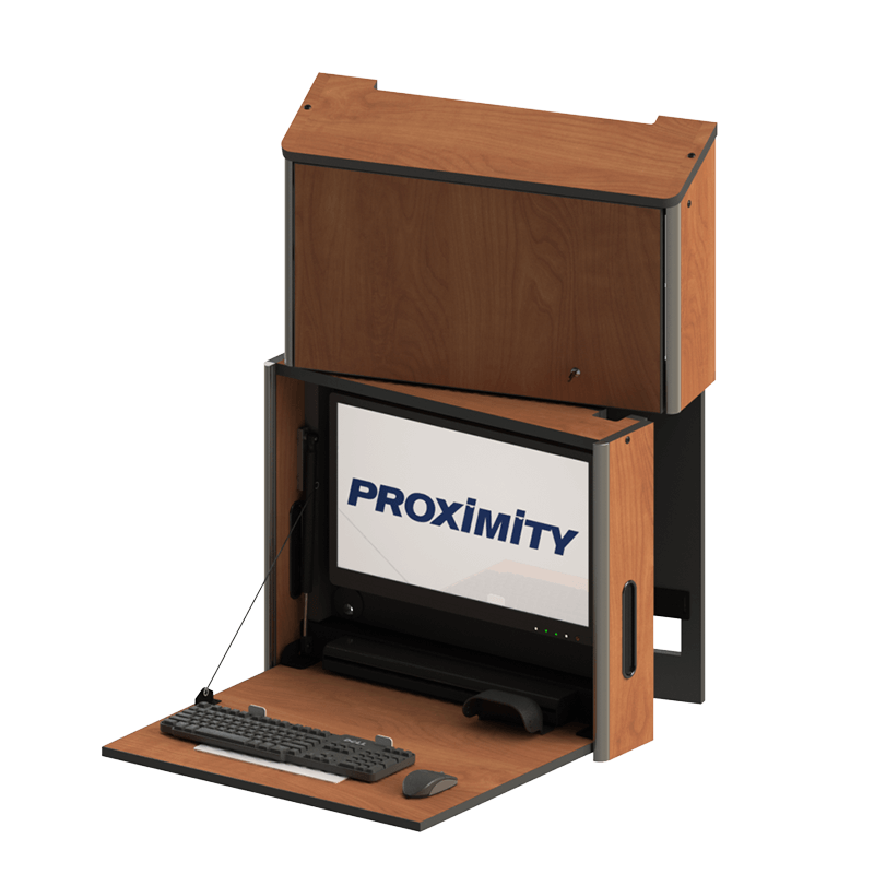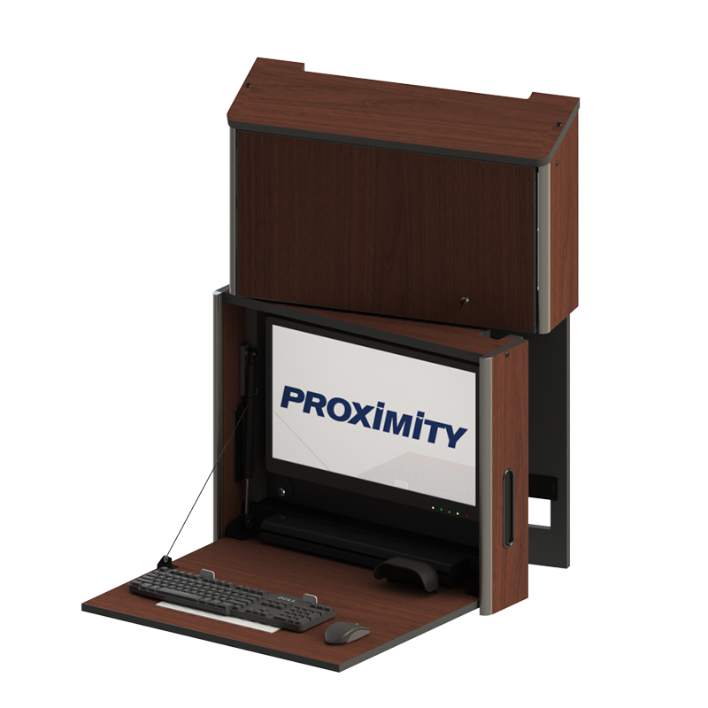 - Unique keyboard and mouse storage allows the keyboard and mouse to dock automatically when the worksurface is closed.