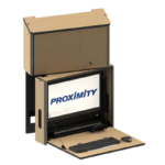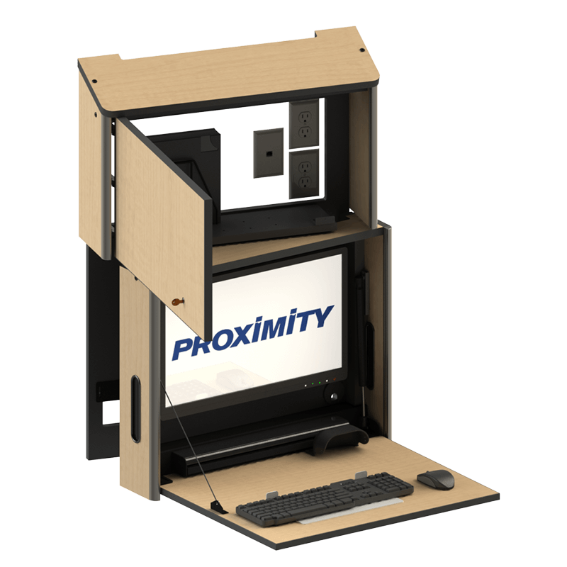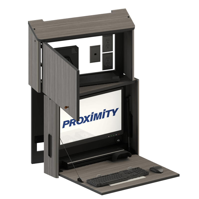 - Unique keyboard and mouse storage allows the keyboard and mouse to dock automatically when the worksurface is closed.